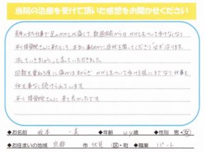 つらい部分や痛い部分に的確に治療をして頂けているので、段々良くなっている実感があります。2月の京都マラソンには良い状態で臨めそうです。スタッフの皆様のあいさつも清々しくそれで元気にもなれます。