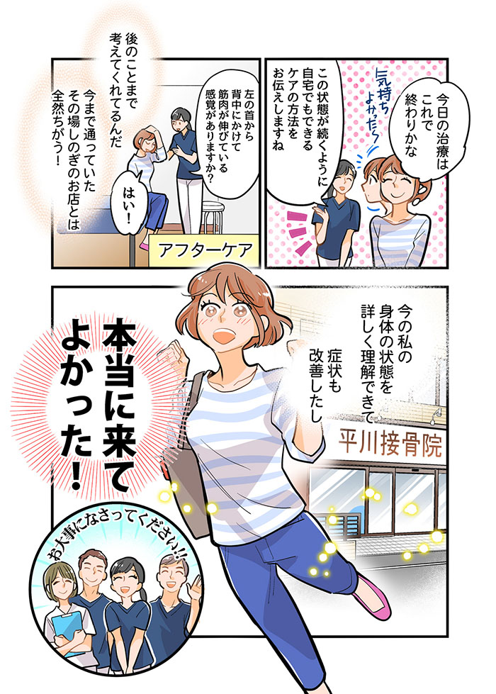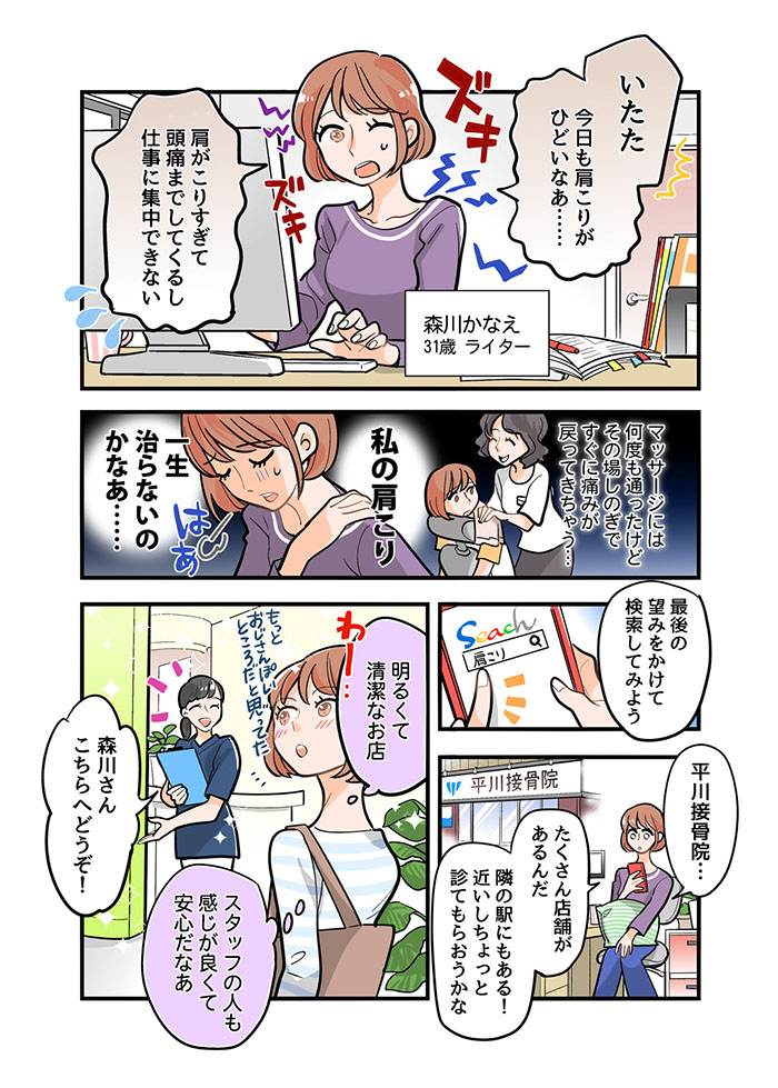 平川接骨院グループではその場しのぎではなく、肩こりを繰り返さないように施術とケア方法をお伝えしています。