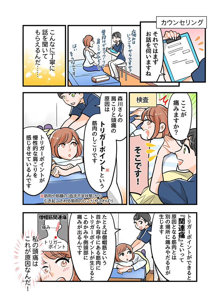 また、より正確に治療を行い根本的に肩こりを解消していくために原因となっている筋肉を割り出す問診や検査に重点を置いています。