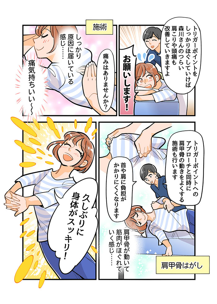 肩こりの原因のトリガーポイントを取り除き、肩甲骨はがしで肩甲骨の可動性を向上させ、セルフケアで長期的な予防を行います。