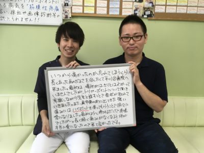 吉川さんの肩こりと腰痛の症状が改善しスタッフ一同大変喜んでおります。