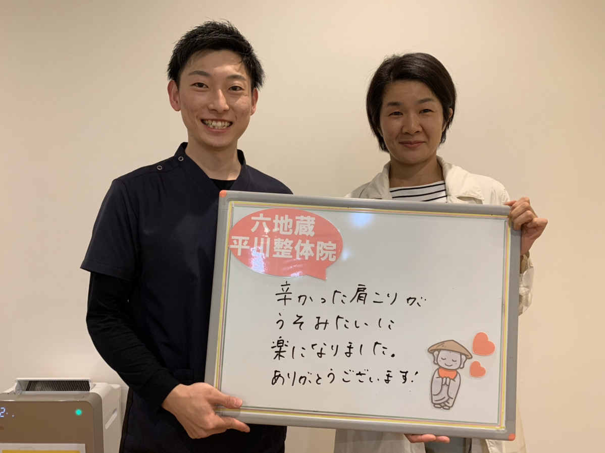 酒井様の肩こりの症状が改善されて本当に良かったです!!肩こりは放っておくと頭痛やしびれといった症状を引き起こします。今後も症状が再発しないようにしっかりケアさせて頂きます!!