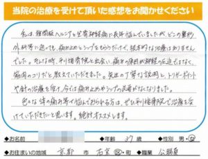 坐骨神経痛で足のしびれとおしりの痛みが出てきて、仕事に支障が出始めたので診ていただきました。最初の数回はほとんど変化が無かったのですが、何回か診てもらっているとしびれ・痛みが徐々に無くなっていき、今ではしびれ・痛みは無くなりました。最初変化が無かった時も先生に必ずしびれ・痛みはとります。と言う言葉を信じて通った結果、今の状態に繋がったんだと思います。本当にありがとうございました。
