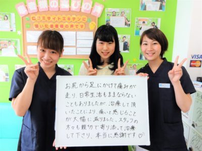 お尻から足にかけて痛みが走り、日常生活もままならないこともありましたが、治療をしていただいたことにより、痛いと感じることが大幅に減りました。スタッフの方々も親切で寄り添って治療して下さり本当に感謝です♥