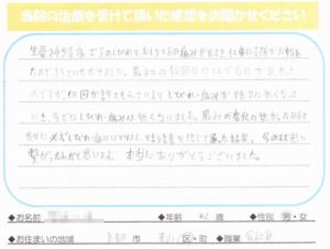 数年来の坐骨神経痛から解放されうれしく思っております。丁寧な治療もして頂き感謝しております。ありがとうございました。