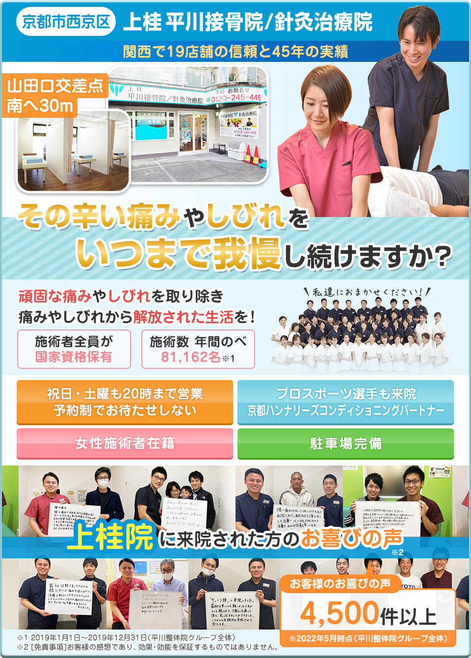京都市の平川接骨院は独自のトリガーポイント治療で、頑固な痛みでも取り除き、根本改善することを徹底的に追求した接骨院グループです。人によって異なる痛みの原因となる筋肉に着目するから、マッサージや整体、他の接骨院では取れない腰や肩の痛み、特にヘルニアやスポーツ障害、交通事故後の症状などの根本改善に自信があります。だからこそ、本気で治したい方に地域で最も口コミを頂いております。