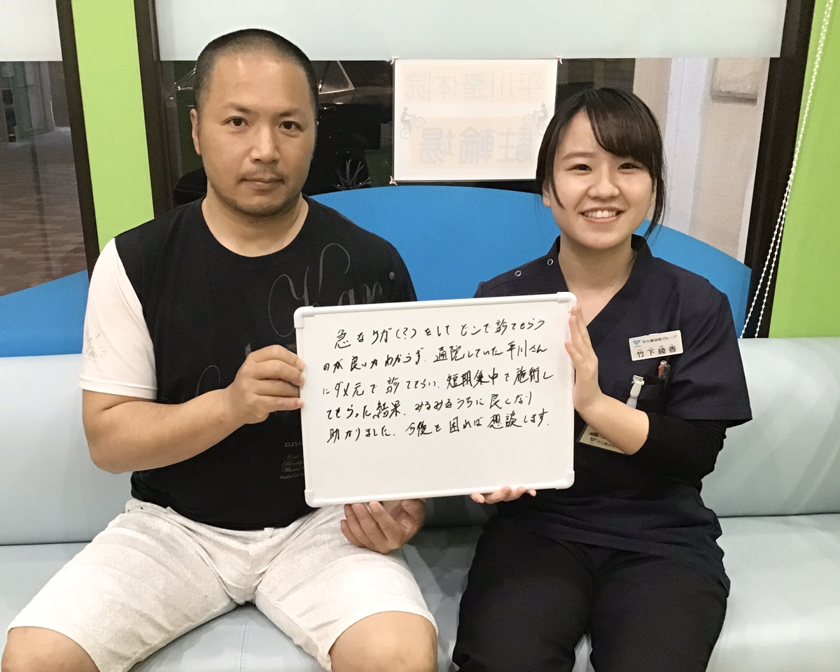 急なけがをしてどこで診てもらうのが良いかわからず通院していた平川さんにダメ元で診てもらい、短期集中で施術してもらった結果みるみるうちによくなり助かりました。