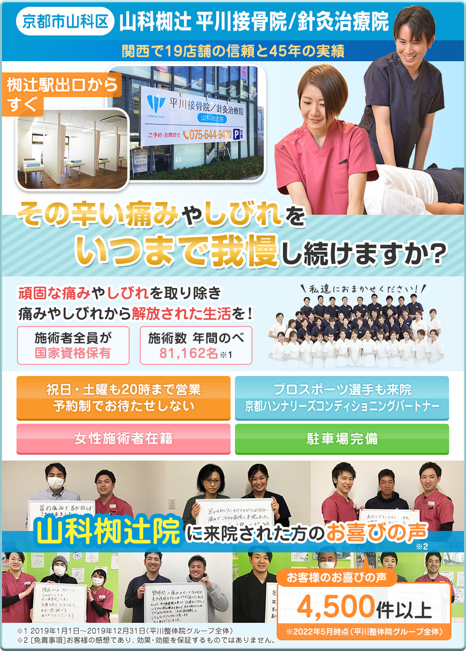 京都市山科区にある山科椥辻 平川接骨院/針灸治療院は京都地下鉄椥辻駅から徒歩1分のところにございますのでとても通いやすい接骨院です。滋賀県から来院されている方も多く幅広い年齢層の方にご利用頂いております。院内は清潔でリラックスして施術を受けて頂ける環境となっております。