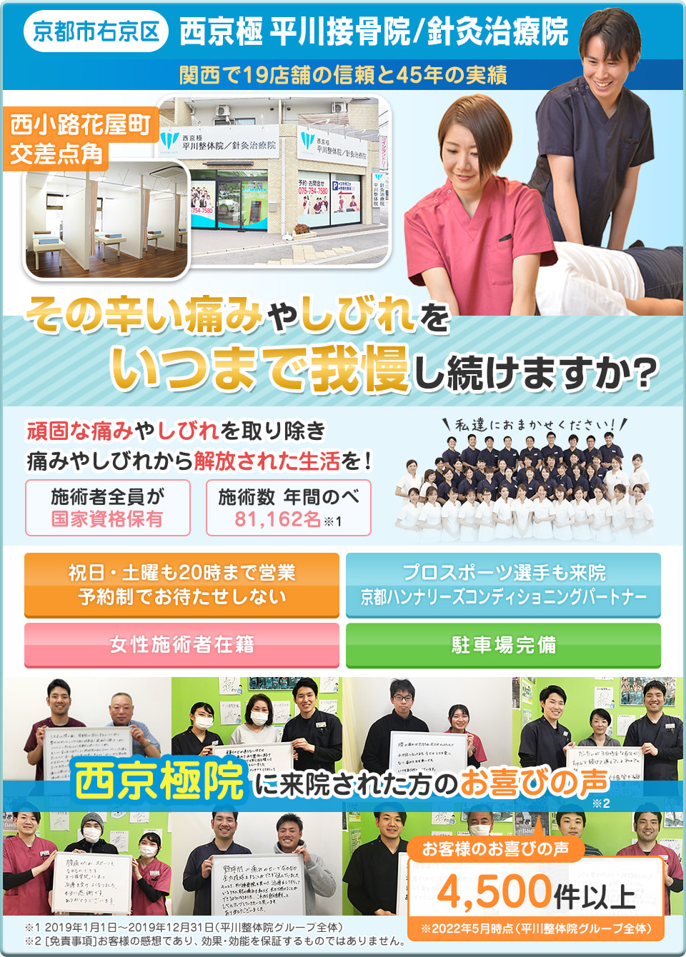 痛みや痺れなどでお困りでしたら是非一度、西京極平川接骨院/鍼灸治療院にご相談下さい。