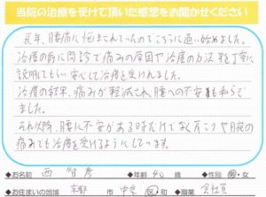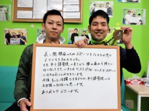 治療をすることによって前まではとても痛かった膝も今ではあまり気にならず思い通り動かせるようになりました!!これからは何事も諦めず色々と頑張っていこうと思いました!!