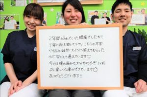 2年間悩んでいた腰痛でしたが丁寧に話を聞いて下さり、こちらの不安や悩み疑問にも1つ1つ答えてもらったので、安心して通えています(^^)今では腰の痛みも大分やわらぎ、以前より楽しく仕事ができています☆ありがとうございます!