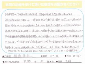 健康体操を5年続けているのですが、ストレッチをやり過ぎたせいか突然右側の足が痛く歩行困難になり病院で診療、レントゲンで診断結果は坐骨神経痛ということで痛み止め薬をいただくだけでした。そこでネットでしらべてみると接骨院での治療がいいように書いてあったので、早速信頼のありそうな接骨院をネットで調べて京都市平川接骨院を選定しました。最初に一週間後に九州、小倉へ行きたいのですが治りますでしょうか?と尋ねたところ「行ける様に治してあげます」と即答を頂き初めて接骨院を受診したのですがすごく信頼を受けました。お蔭様で完治し大変喜んでおります。