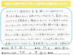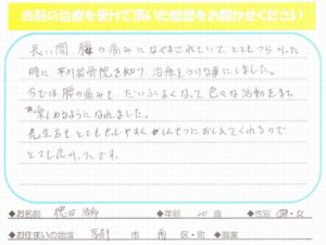 坐骨神経痛で足のしびれとおしりの痛みが出てきて、仕事に支障が出始めたので診ていただきました。最初の数回はほとんど変化が無かったのですが、何回か診てもらっているとしびれ・痛みが徐々に無くなっていき、今ではしびれ・痛みは無くなりました。最初変化が無かった時も先生に必ずしびれ・痛みはとります。と言う言葉を信じて通った結果、今の状態に繋がったんだと思います。本当にありがとうございました。