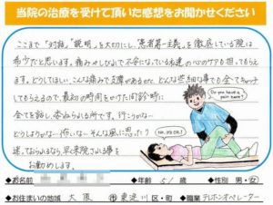 S.I様の坐骨神経痛の症状であるお尻の痛みと足のしびれが解消させて本当に良かったです。坐骨神経痛の症状も正しく原因を突き止めて治療を行えば症状は取れます。今回の原因はお尻の筋肉のトリガーポイントが原因でした。今後も坐骨神経痛の痛みやしびれが再発しないようにしっかりとケアさせていただきます。