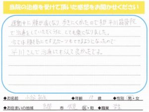運動中に腰が痛くなり、歩きにくかったのですが京都市平川接骨院で治療をしていただくうちに、とても楽になりました。今では腰も気にせずスポーツもできるようになったので平川接骨院で治療してもらえて良かったです。